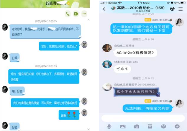 为了改变这一状况,高等数学教师进行了线上讨论。各位教师本着“一个都不能少”的原则,对在线学习时长短、作业完成较差、经常请假不上课的学生进行一一回访,了解学生的真实情况,并进行具体问题具体分析,让学生在感受到教师的关爱关怀中,自觉应好好进行学习,继续跟上班级的学习进度。特别严重的情况,教师通过私下和家长的交流,共同营造学生学习环境,让学生重拾学习的热情。