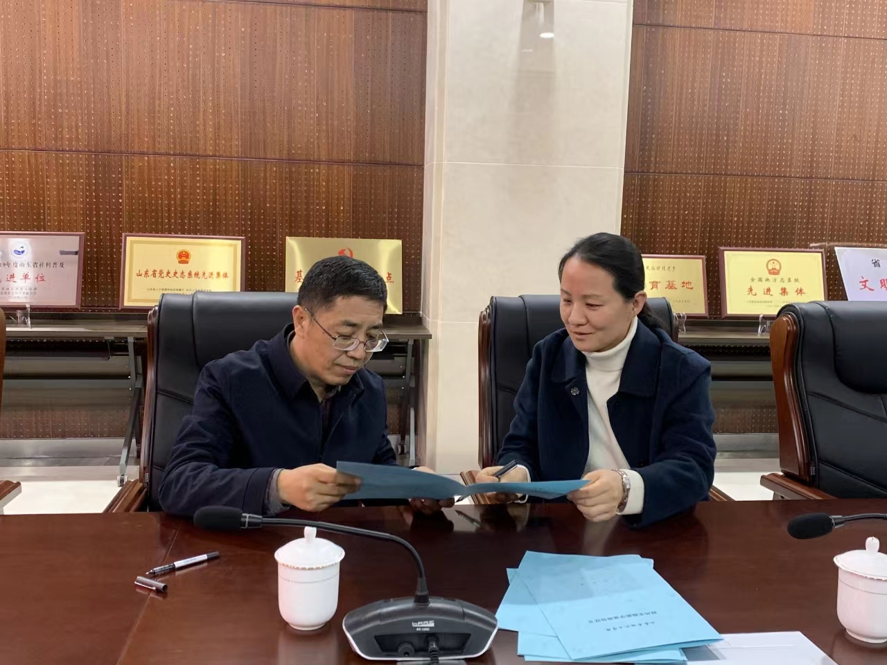 签约仪式上,尹健与杨立宇共同签署了校外实践教学基地协议,并为“思政课实践教学基地”揭牌。杨立宇表示将大力支持我校思政实践育人,发挥好实践教学基地的教育功能。尹健表示在双方进一步合作中,马克思主义学院将发挥高校在科学研究、理论宣讲等方面的突出优势,以知促行、以行求知,推动理论与实践结合,共同促进区域文化在传承中不断实现创新。
