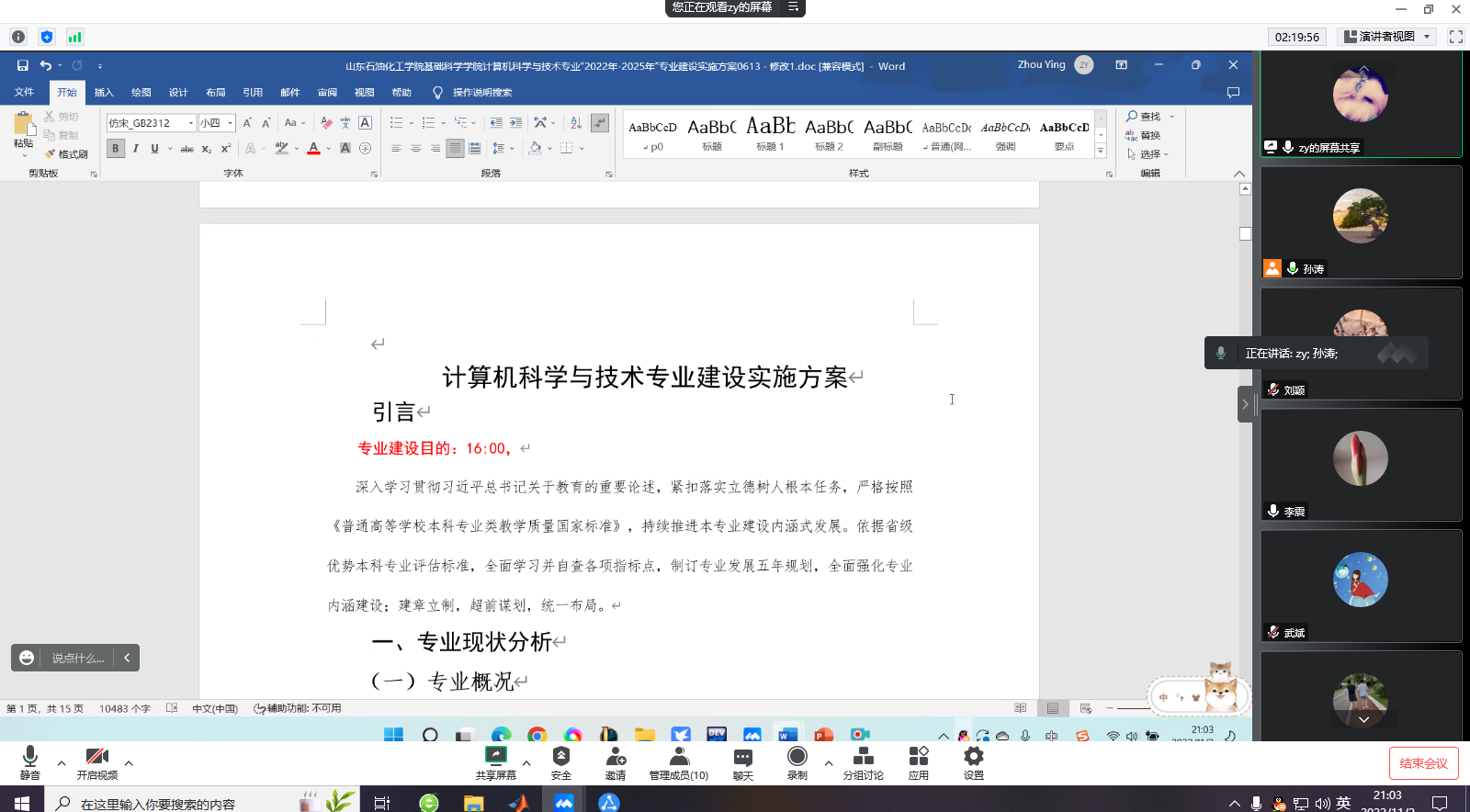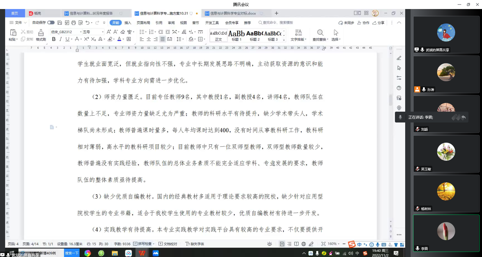 会上,学院四个专业的负责人分别汇报了各自专业的对标分析和2022-2025专业建设实施规划方案。与会教师对方案进行了讨论,对专业对标的选择、存在的问题、专业的定位等进行了分析,特别是对专业建设的目标、任务和举措等提出了修改建议。研讨会持续了三个小时,参会教师进行了充分的交流和讨论。