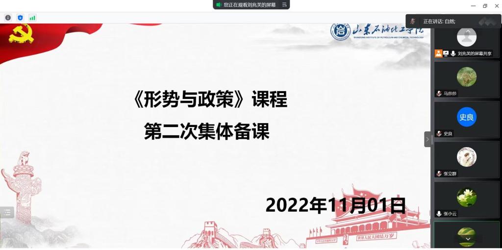 11月1日下午,马克思主义学院举办2022秋季学期第二次“形势与政策”集体备课会,会议通过“腾讯会议”平台以线上形式召开,形势与政策教研室主任刘兆芙主持会议。