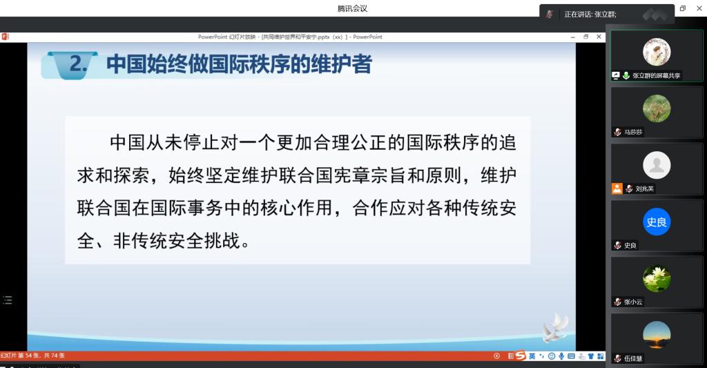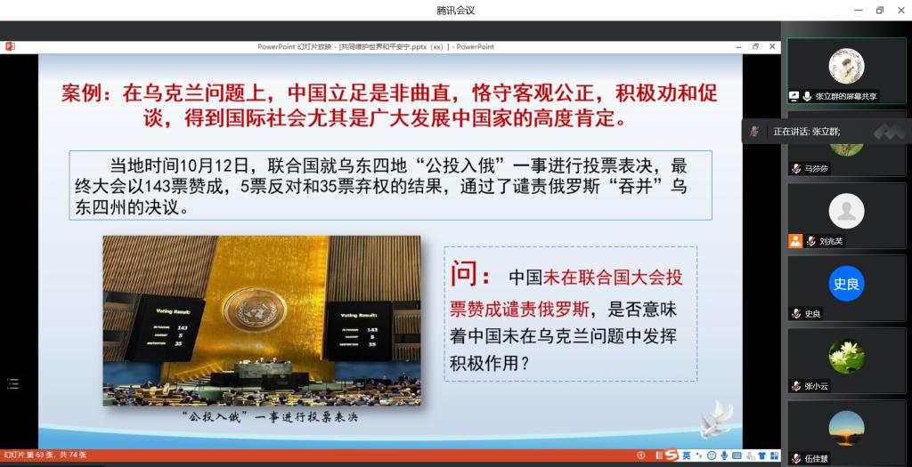 刘兆芙首先对本学期“形势与政策”大四学生的课程考核方式及考核内容作了具体说明。在前期小组备课基础上,本次集体备课由主备教师张小云和张立群分别围绕“乌克兰危机演变及影响”和“共同维护世界和平安宁”两个专题进行说课展示。与会人员围绕教学内容、教学方式和教学重难点问题等进行了深入交流。
