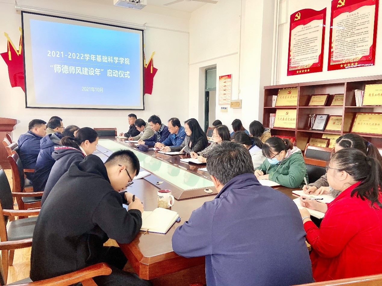 2021年10月18日上午,学院在主楼702会议室举行“基础科学学院师德师风建设年”启动仪式。学院党总支书记、执行院长杨树林出席并讲话,学院副院长、各系部(办)主要负责人及教师代表参加活动。学院党总支副书记陈晓楠主持。