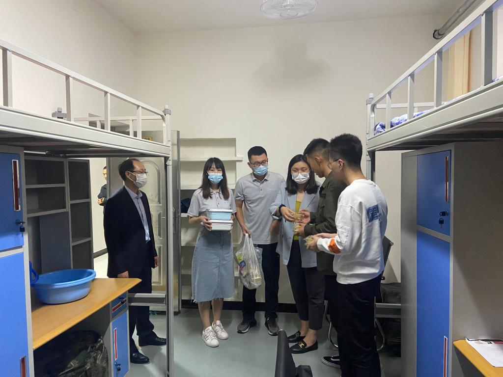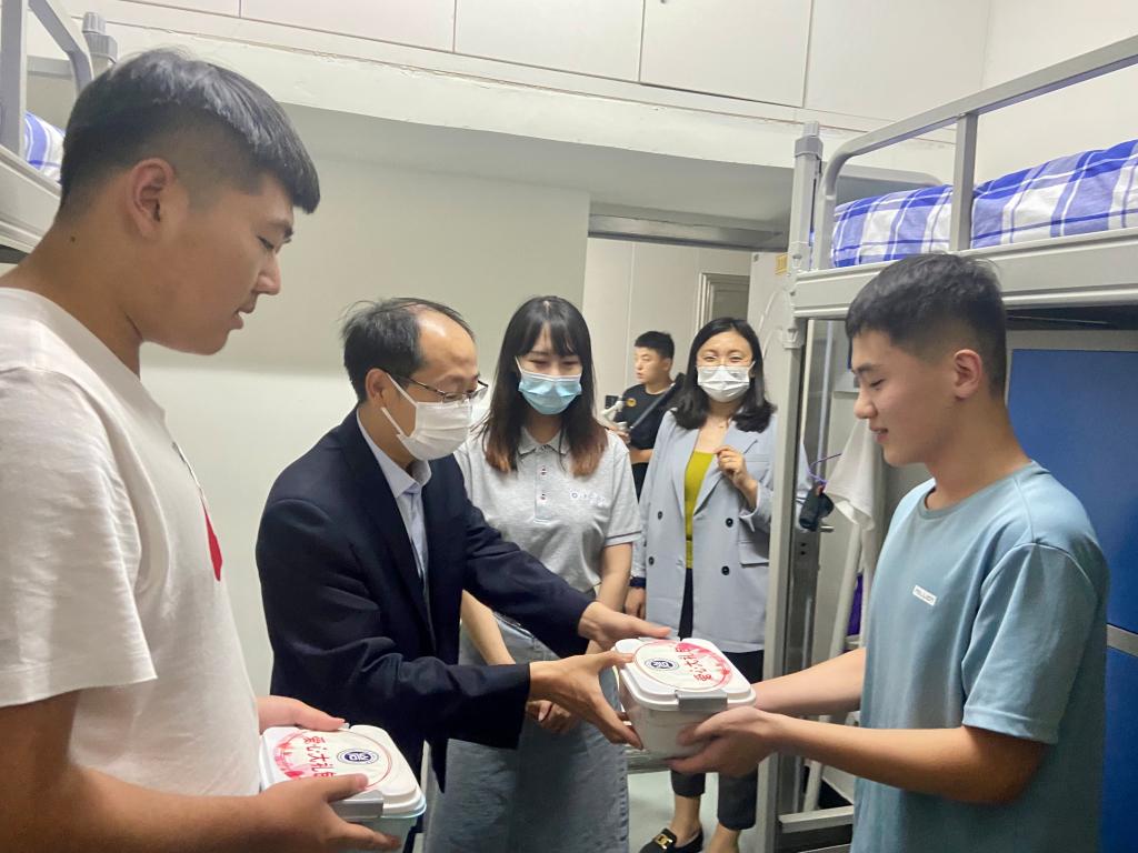 杨院长详细询问了学生们的学习、生活情况,了解学生生活和学习需求,鼓励大家安心学习,有任何困难随时联系学院老师。同时,嘱咐大家“非必要不出校”、遵纪守规,希望大家安心学习,要健康作息、注意勤通风、勤洗手、戴口罩,以实际行动做好疫情防控。走访宿舍活动中,领导和老师们代表学校向每个宿舍赠送了含有学校定制款月饼的“节日礼包”。