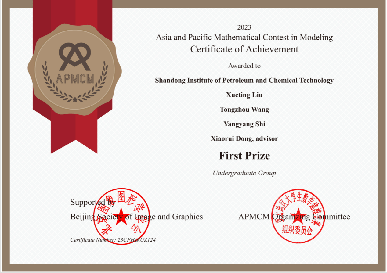 近日,我院学子刘雪婷、王统洲、石阳阳同学,在董晓睿副教授的精心指导下,在第十三届亚太地区大学生数学建模竞赛(APMCM)参赛队中脱颖而出,荣获一等奖。