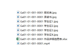 报送至学校的电子版文件,内容包括:作品文件以及报名表、承诺书、所有作者的学生证拍图、作品详细信息表(作品文件均以参赛编号命名,其他文件命名方式:参赛编号+报名表、参赛编号+承诺书、参赛编号+学生证1、参赛编号+学生证2、作品详细信息表,作品详细信息表格式见附件2),报名表和承诺书都需要电子签名,最后必须以zip或rar压缩包整理所有文件,文件命名为参赛编号,可参看下列图示举例: