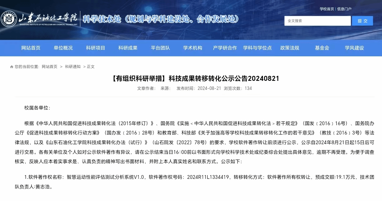 学院致力于科技创新与产业应用的深度融合,积极搭建平台,促进科研成果转化为实际生产力,推动经济社会发展。黄志浩老师成功转化成果1项,成果转化信息如下: